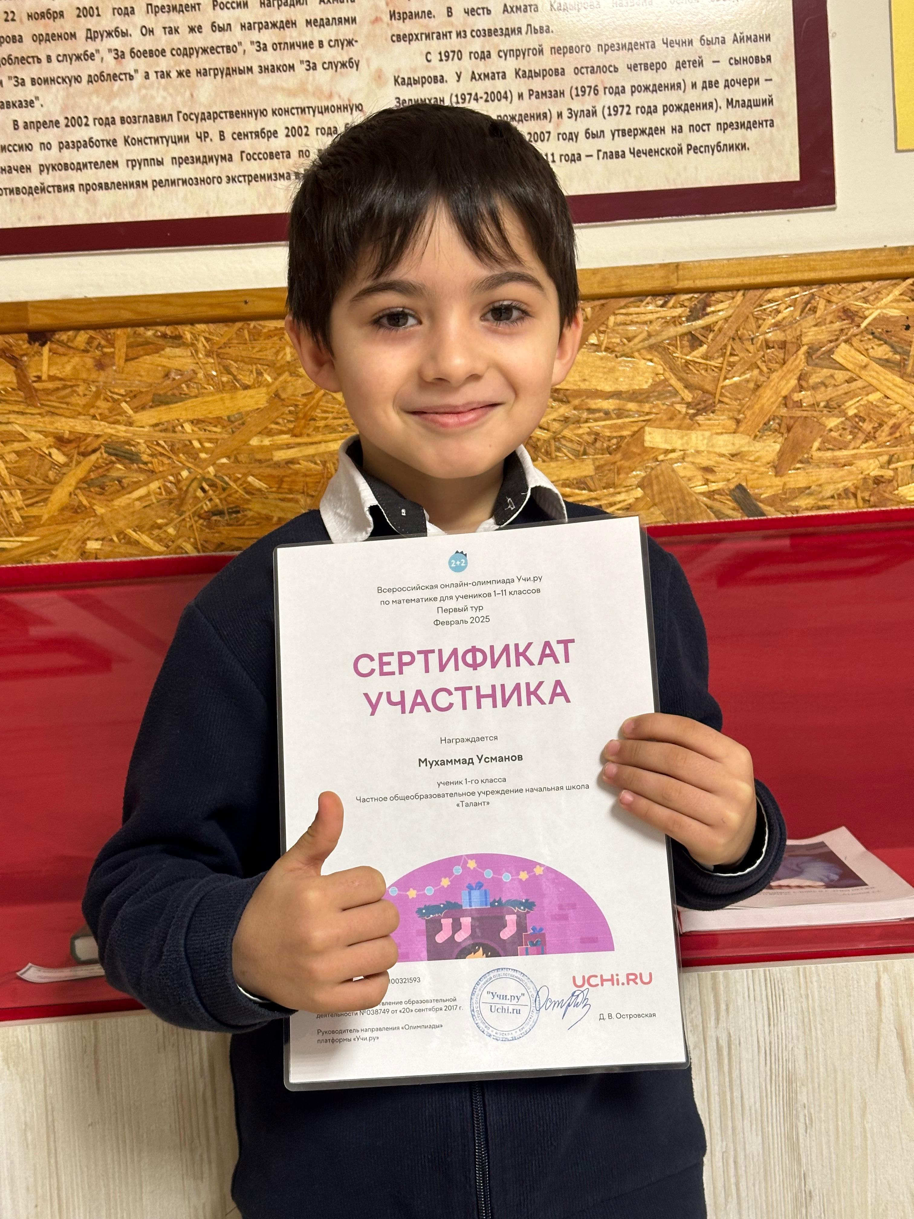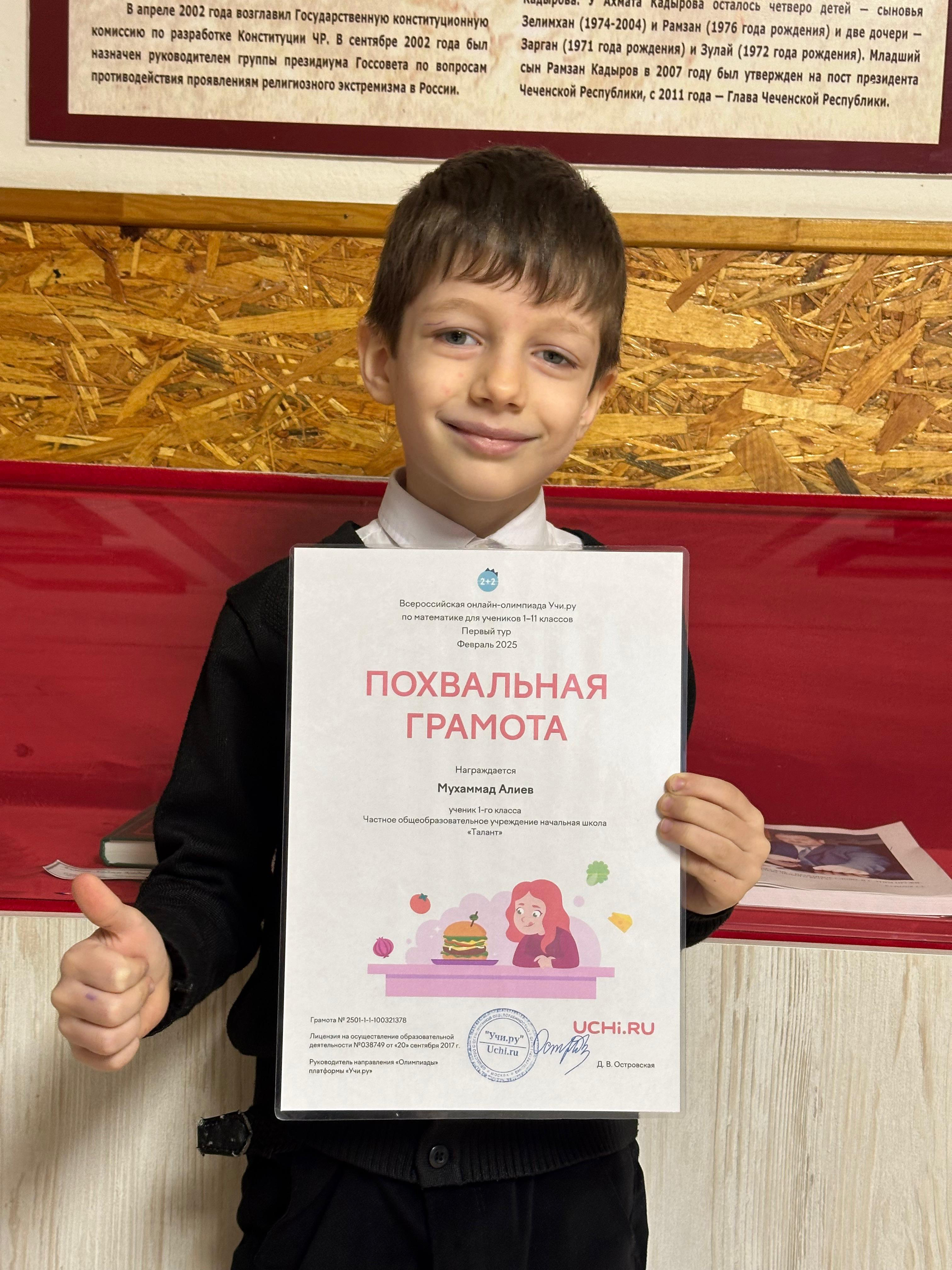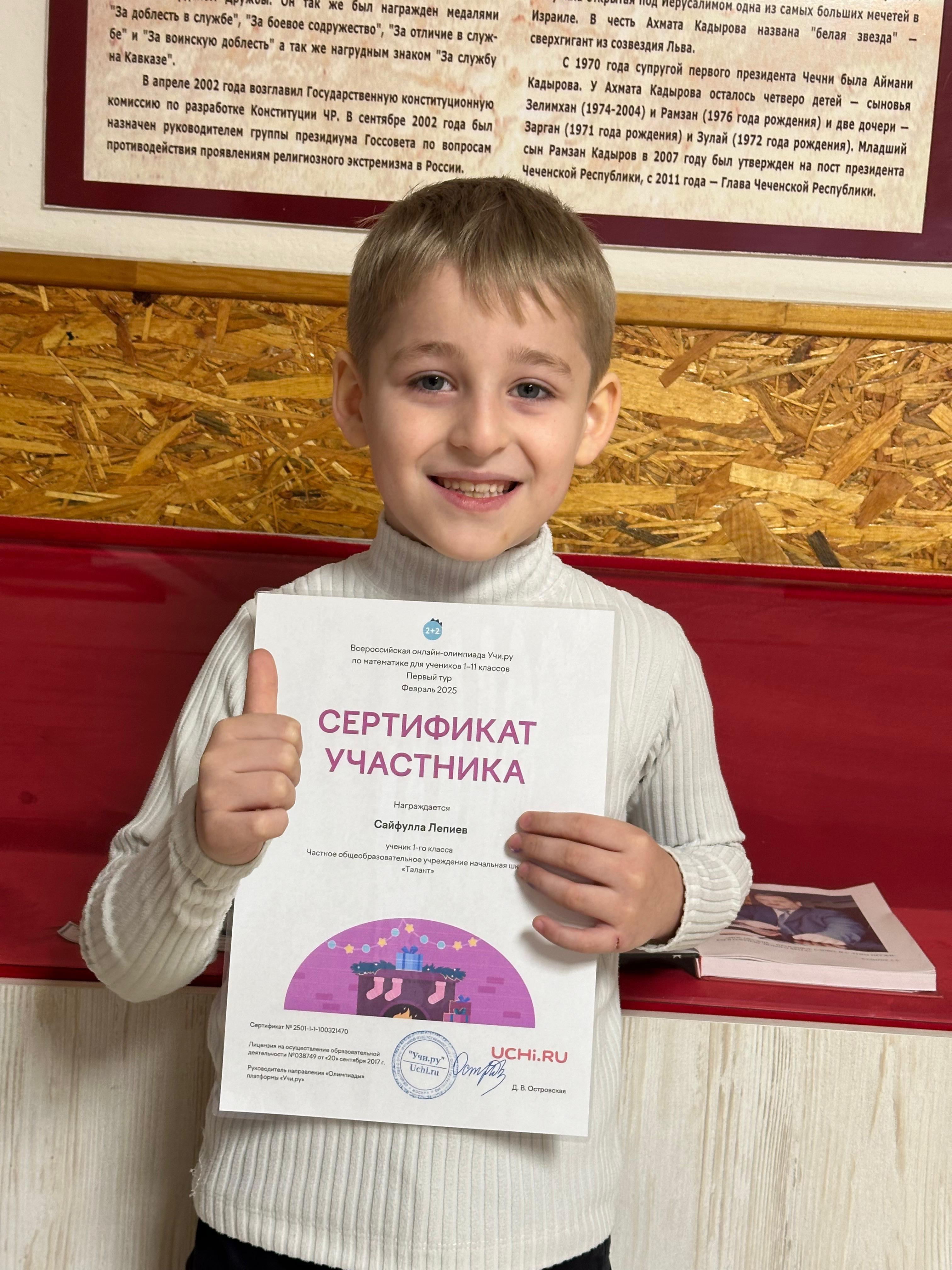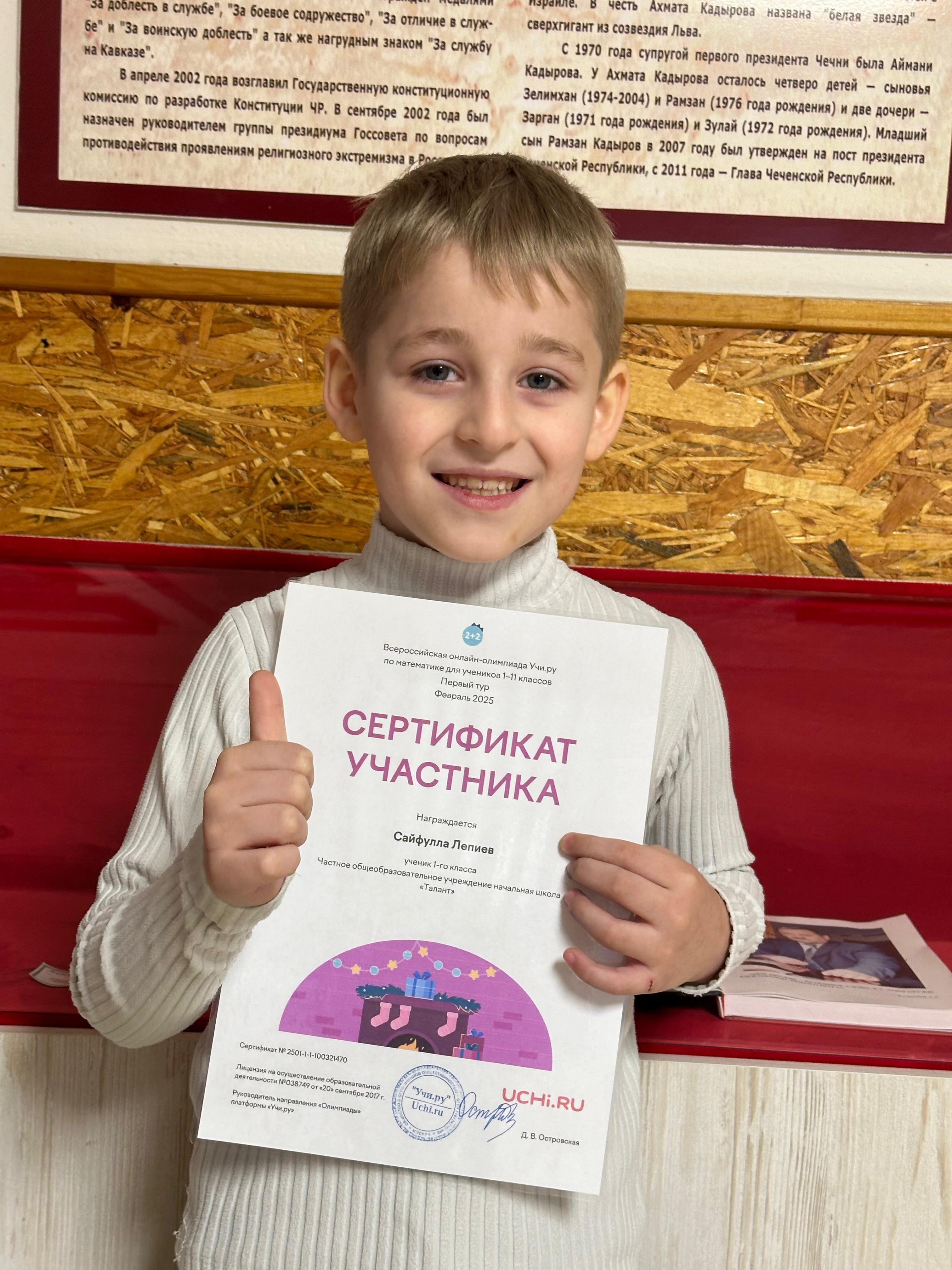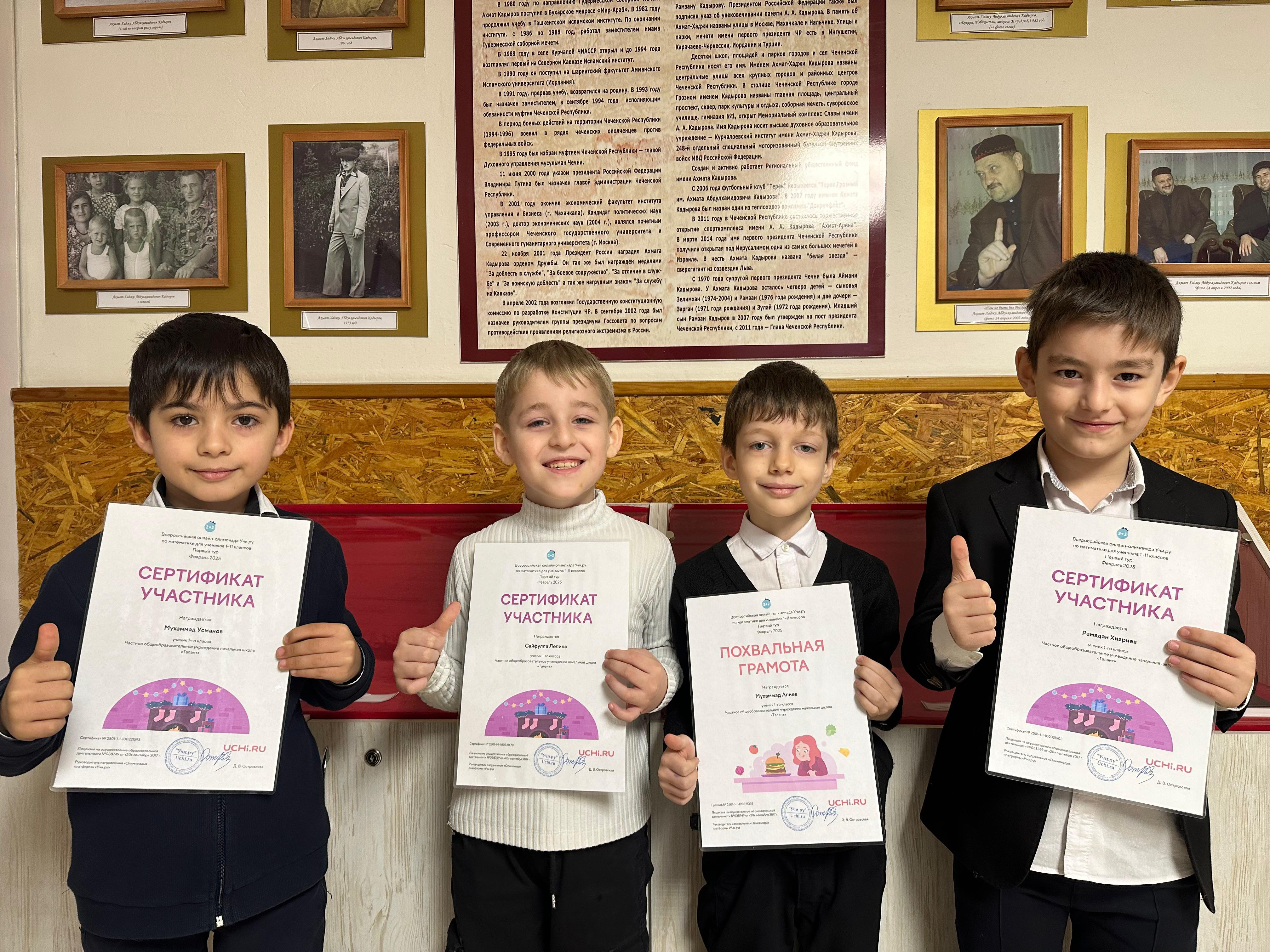 Учащиеся 1 «В» ЧОУ НОШ «Талант» приняли участие во всероссийской онлайн-олимпиаде Учи. ру по математике и получили похвальные грамоты и сертификаты участников. Классный руководитель: Яхьяева И. М-С.